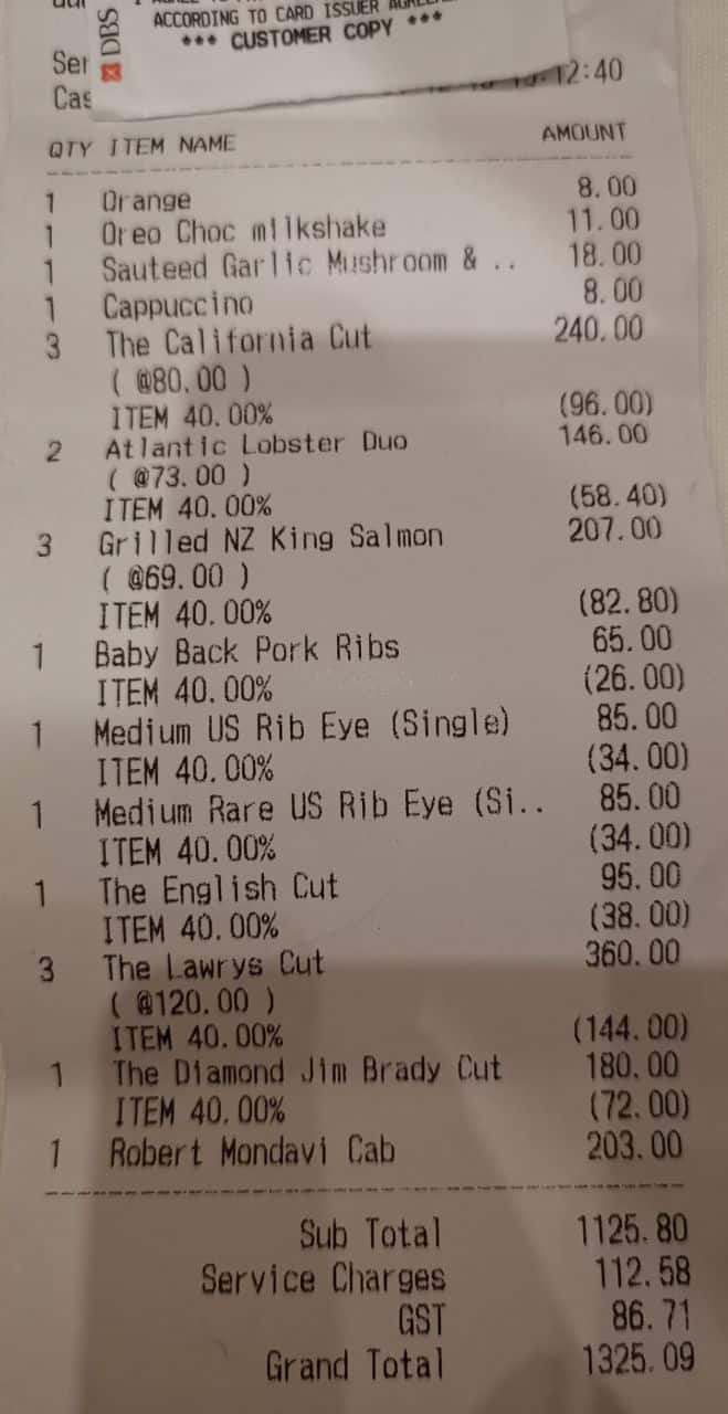 And the bill which amounted to around $2k before deduction! Many thanks to a lady who had 40% discount off the mains dishes in the menu!