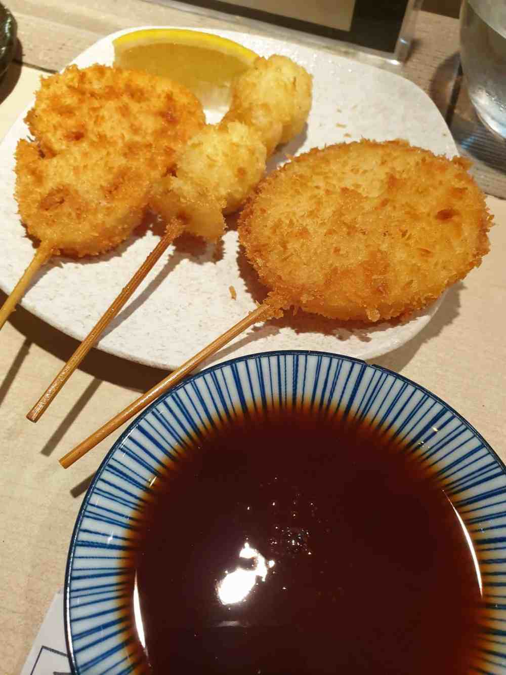 The deep fried yakitori. The quail eggs and dipping sauce were not bad.