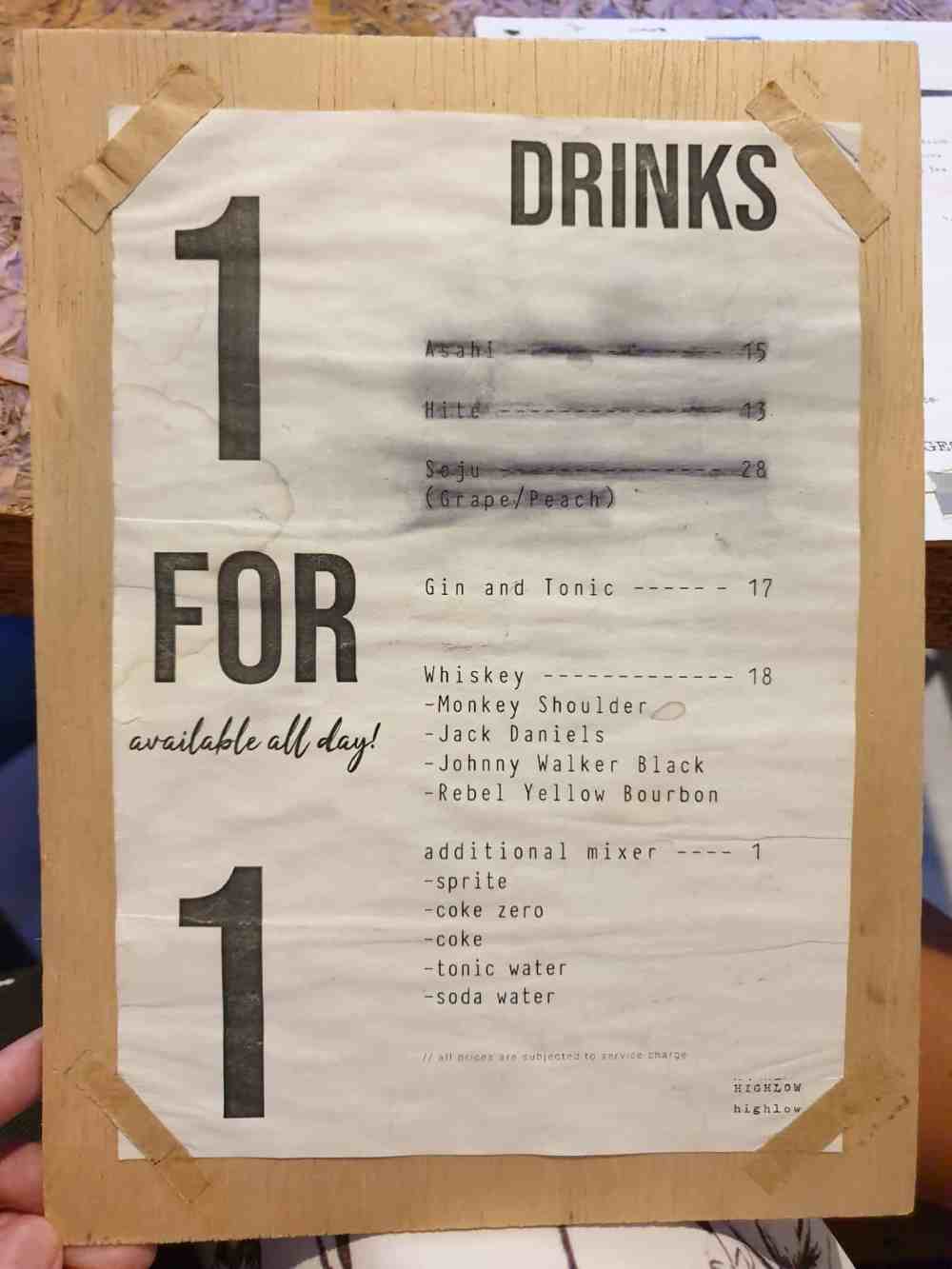 All day 1 for 1 drinks menu: